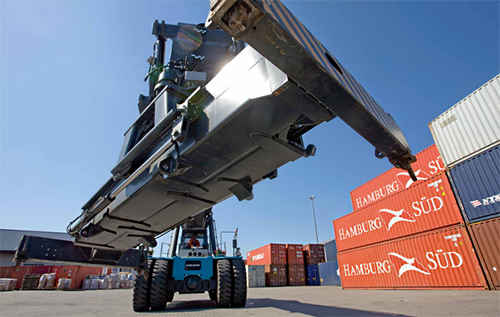 集裝箱正面吊是專為國內(nèi)中小型集裝箱貨場生產(chǎn)的作業(yè)成本更低的一種集裝箱吊車。該車要求在平整,經(jīng)過硬化,無坑洼的場地上使用。每組由兩臺吊車構(gòu)成,每臺都是獨立的運動單元,各運動單元為兩輪驅(qū)動,四輪轉(zhuǎn)向。